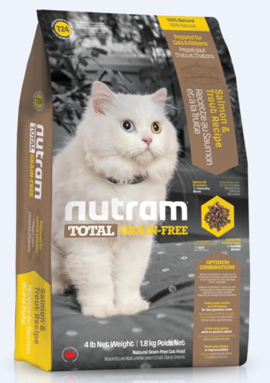 T24 Nutram Total Grain-Free® Salmon & Trout Natural Cat Food is a Holistic, multi-beneficial, and nutrient-rich recipe that improves your pet’s wellness from the inside-out. Our Holistic approach starts with wholesome ingredients you can pronounce, such as a blend of low-glycemic Green Peas, Lentils and Chickpeas as a source of healthy carbs and quality protein. This, combined with a blend of Turmeric, a source of curcumin, and Salmon Oil, rich in Omega-3 fatty acids, provide immune boosting properties to help support a strong immune system. Nutram's Optimum Combinations™ goes further and offers Cranberries, a natural acidifier, and Celery Seeds, an effective diuretic, to help maintain healthy fluid levels, working together with proper pH and moderate ash levels to support a healthy bladder. You can be confident that your pet’s food is healing, wholesome and part of a total wellness lifestyle.
