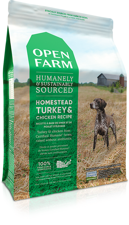 Open Farm Homestead Turkey & Chicken recipe is formulated to meet the nutritional levels established by the AAFCO Dog Food Nutrient Profiles for all life stages including growth of large-size dogs (70 lbs or more as an adult).