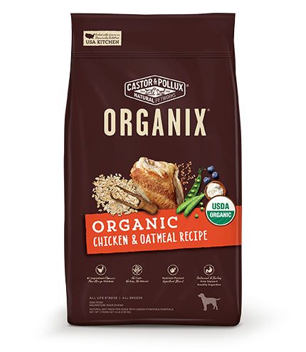 ORGANIX Chicken & Oatmeal Recipe Dog Food is formulated to meet the nutritional levels established by the AAFCO Dog Food Nutrient Profiles for All Life Stages including growth of large size dogs (70 lbs or more as an adult).